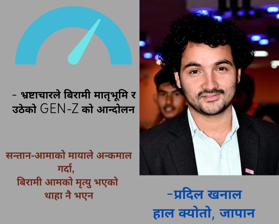 वर्तमान परिवेशमा नेपालको राजनीतिक अवस्था स्थिर नहुनु र भ्रष्टाचार चरम बिन्दु पार गरेको स्थिति हामी सबैलाई अवगत नै थियो। जसमा अहिले उच्च शिक्षा अध्ययनशील सचेत युवाले विरोध कार्यक्रमको आयोजना गरे जुन GEN-Z युवा पुस्ताको नामबाट सुरू भएको शान्तिपूर्ण आन्दोलन युद्धभूमिमा परिणत भयो। पहिलो दिन भएको घटना, घटना होइन, म अपराधको रूपमा लिएको छु, जुन सत्ता र शक्तिको डम्ब, कसैको सन्तुष्टि पार्ने गरिएको गोली प्रहार अहिलेका युवा विद्यार्थी, भोलिका नेतृत्वको हत्या हुन पुगेको छ। उनीहरूको एक गलत कदमले देश रक्तभूमिमा परिणत भयो। GEN-Z गलत थिएन, सही थियो र आन्दोलन पनि सही!